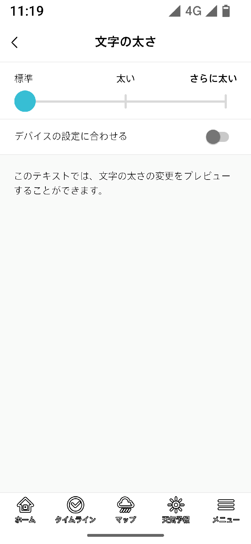 同様に、文字の太さも「標準」「太い」「さらに太い」の3段階から選べます。また、デバイスの設定値に合わせる「デバイスの設定に合わせる」も選べます。