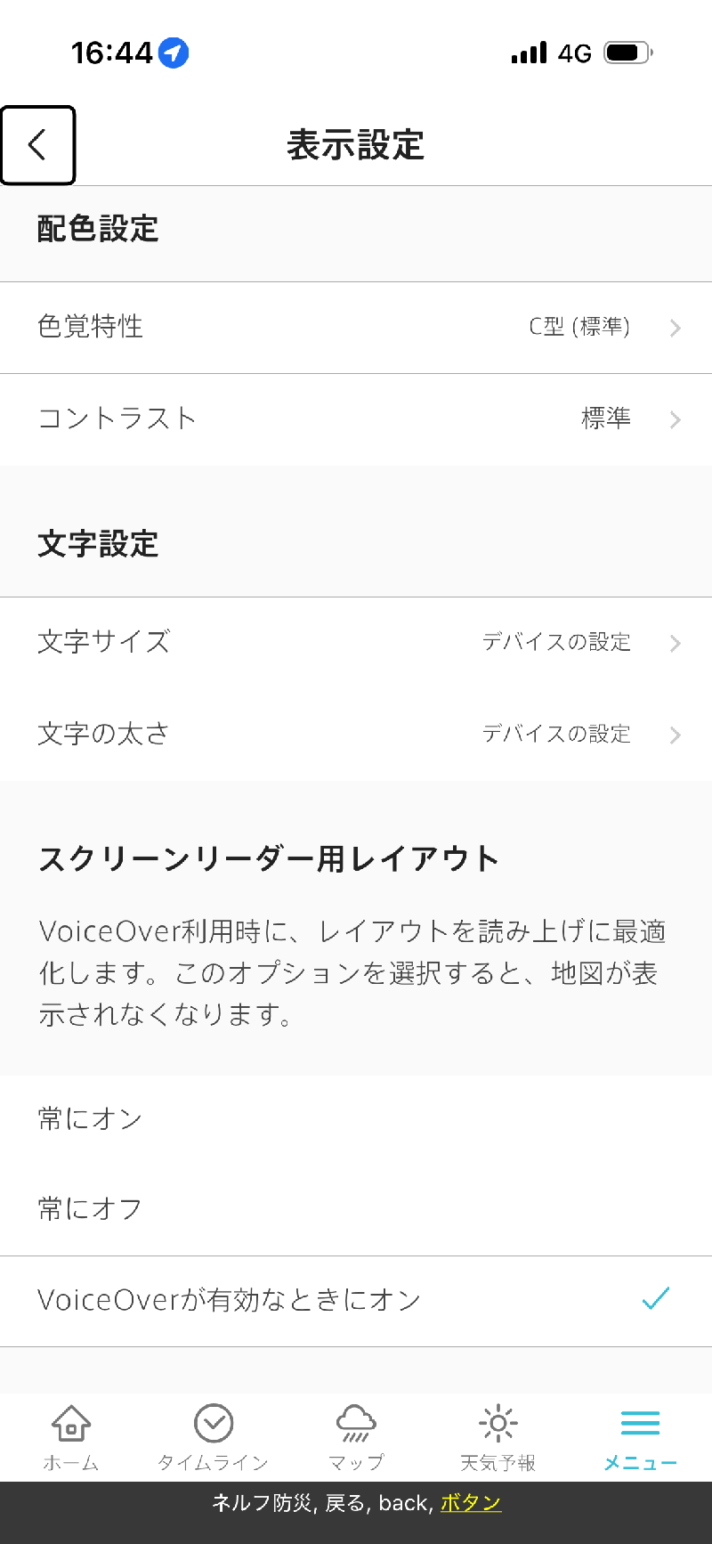 「VoiceOver(Androidの場合TalkBack)が有効なときにオン」は、VoiceOver(Androidの場合TalkBack)が起動しているときは地図を表示せず、起動していないときは地図を表示するようになっています。