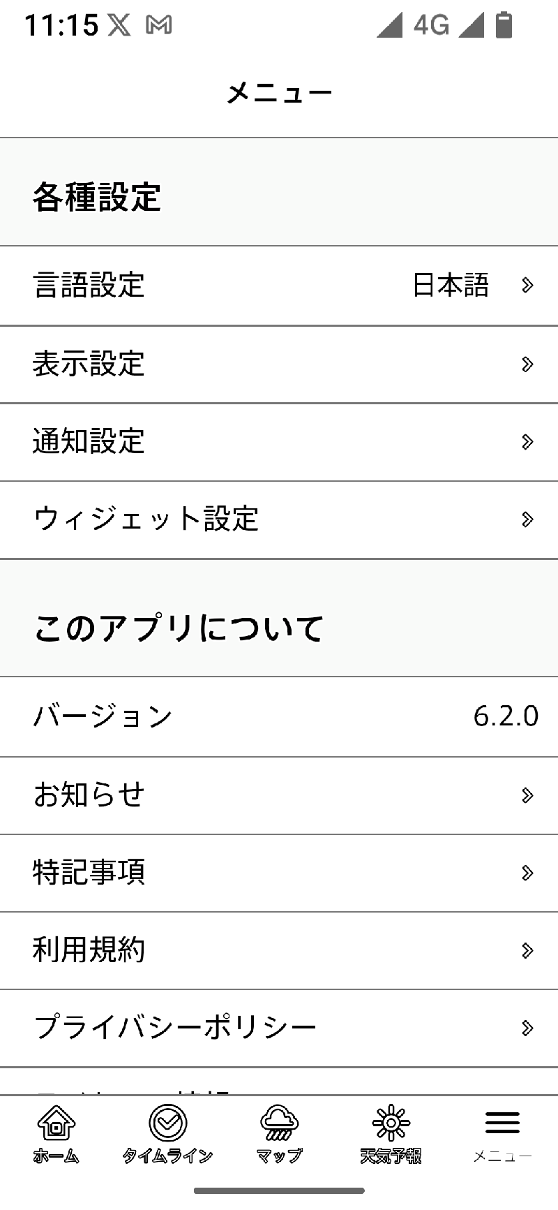画面の下部には、共通のメニューラインがあり、左から「ホーム」「タイムライン」「マップ」「天気予報」「メニュー」の5つのボタンが並んでおり、それぞれ選択できます。