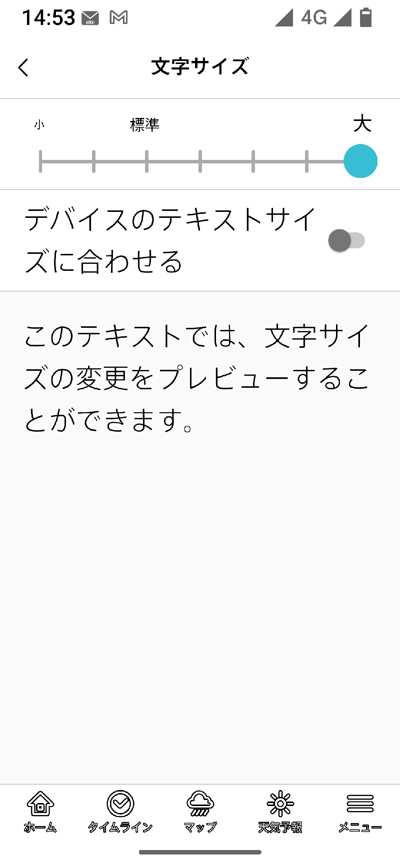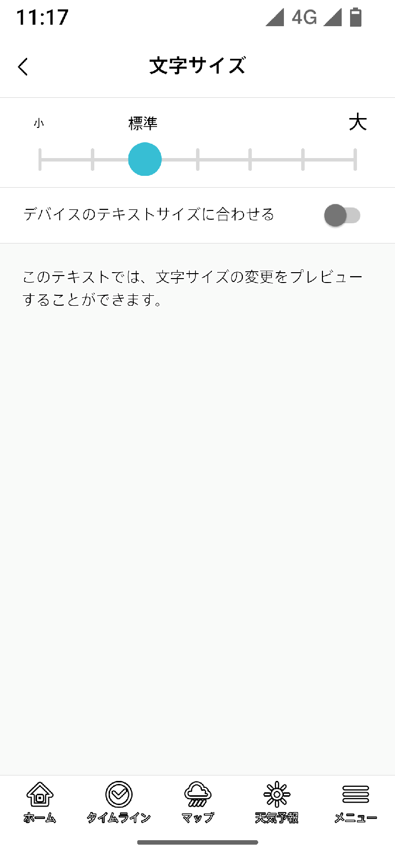 文字サイズは小から大までの7段階(標準は3段目)。スライダーの目盛を選択することで決定します。そのほかに、デバイス側の設定値に合わせる「デバイスのテキストサイズに合わせる」も選べます。