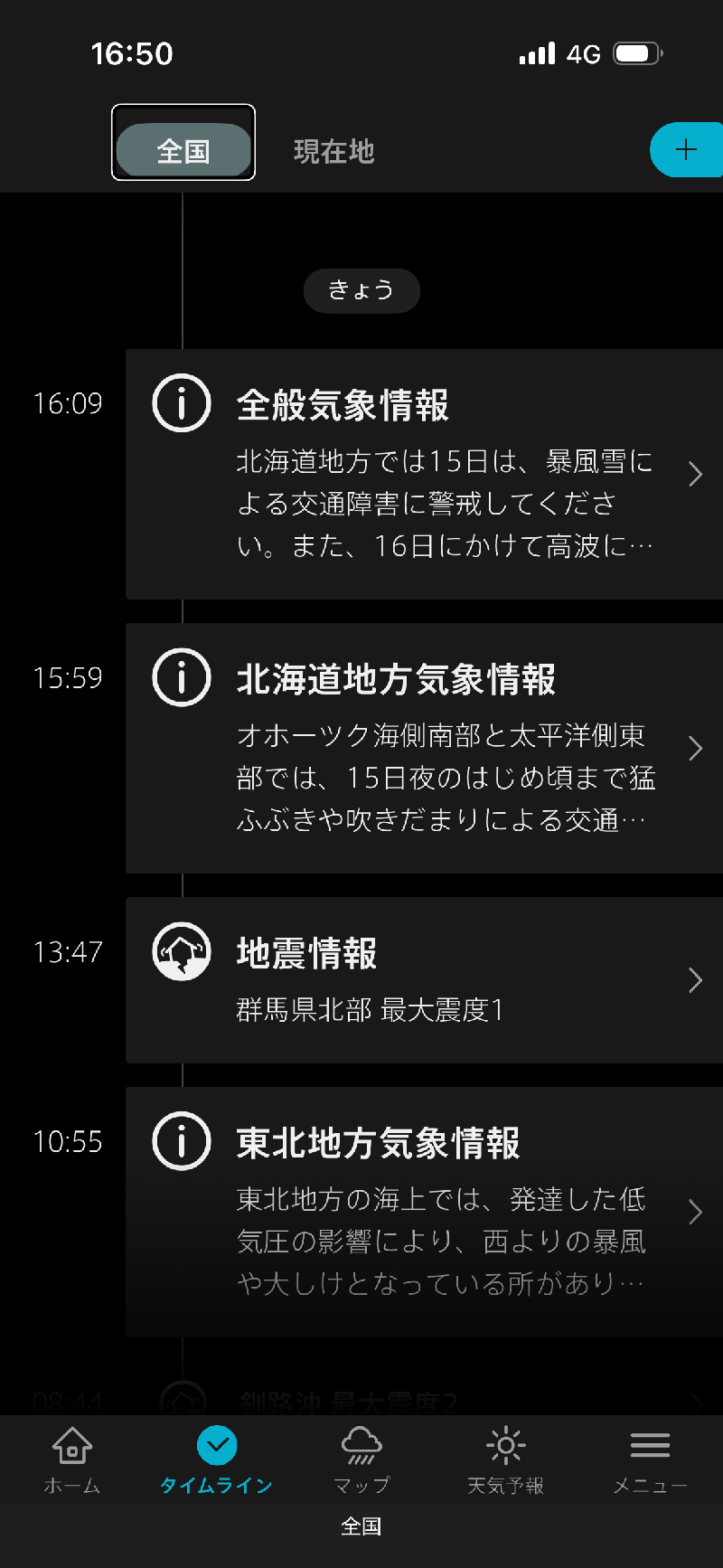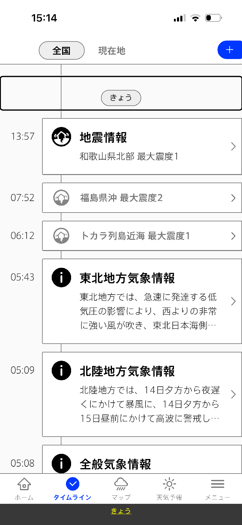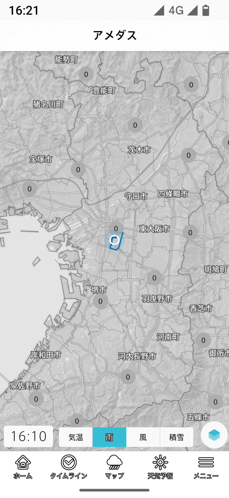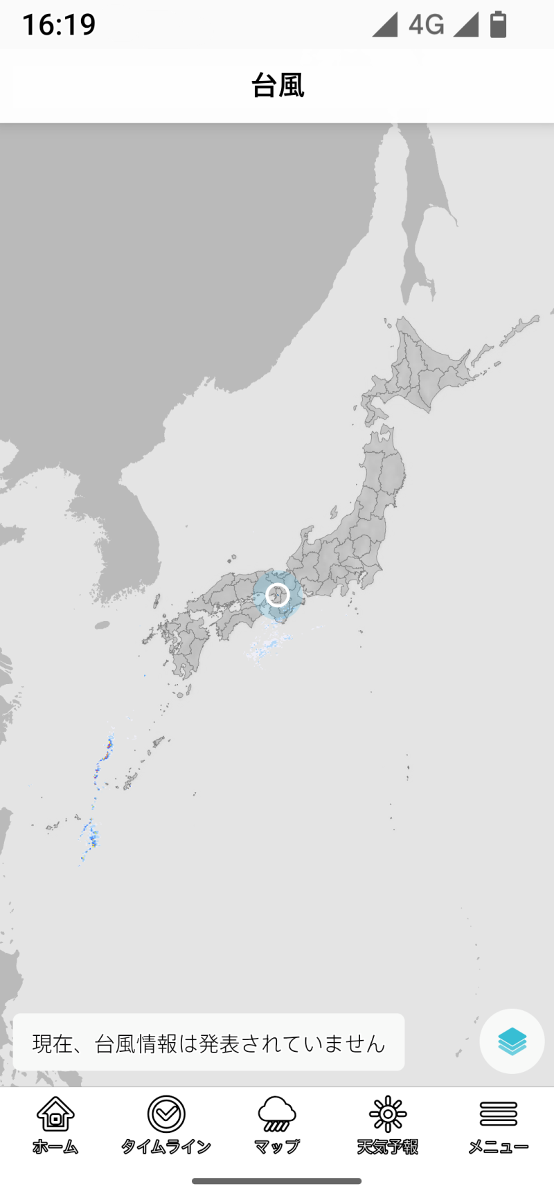 台風を選択すると、無条件に全国地図を選択します。以後は全国に切り替わってしまうので、登録地域や現在地のほかのレイヤーを表示しようとする場合には、一旦メニューラインでホームやタイムラインを選び、そこで登録地域や現在地を切り替える手間が生じます。