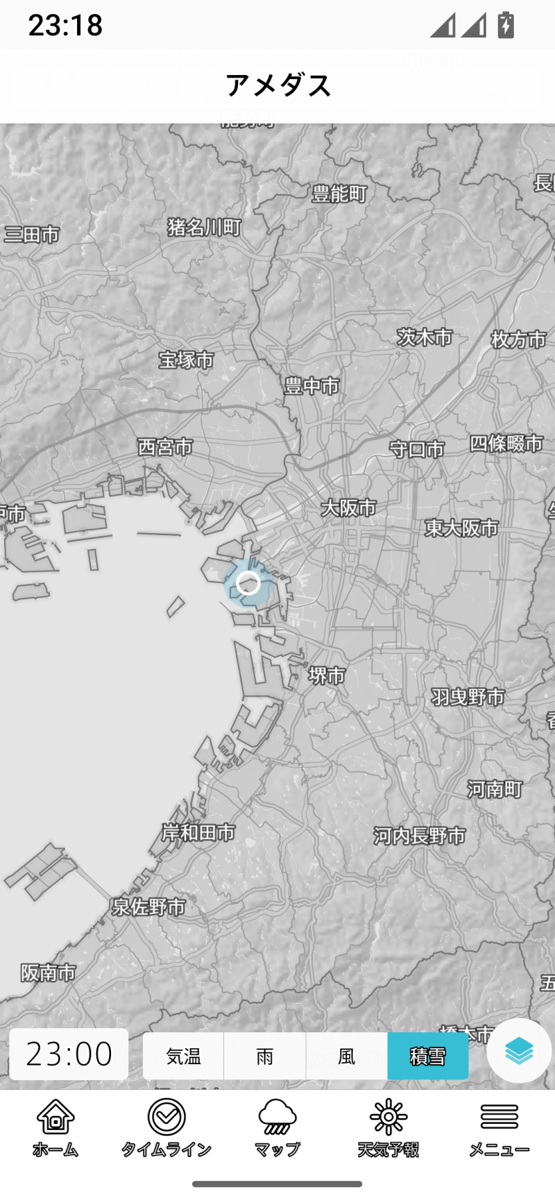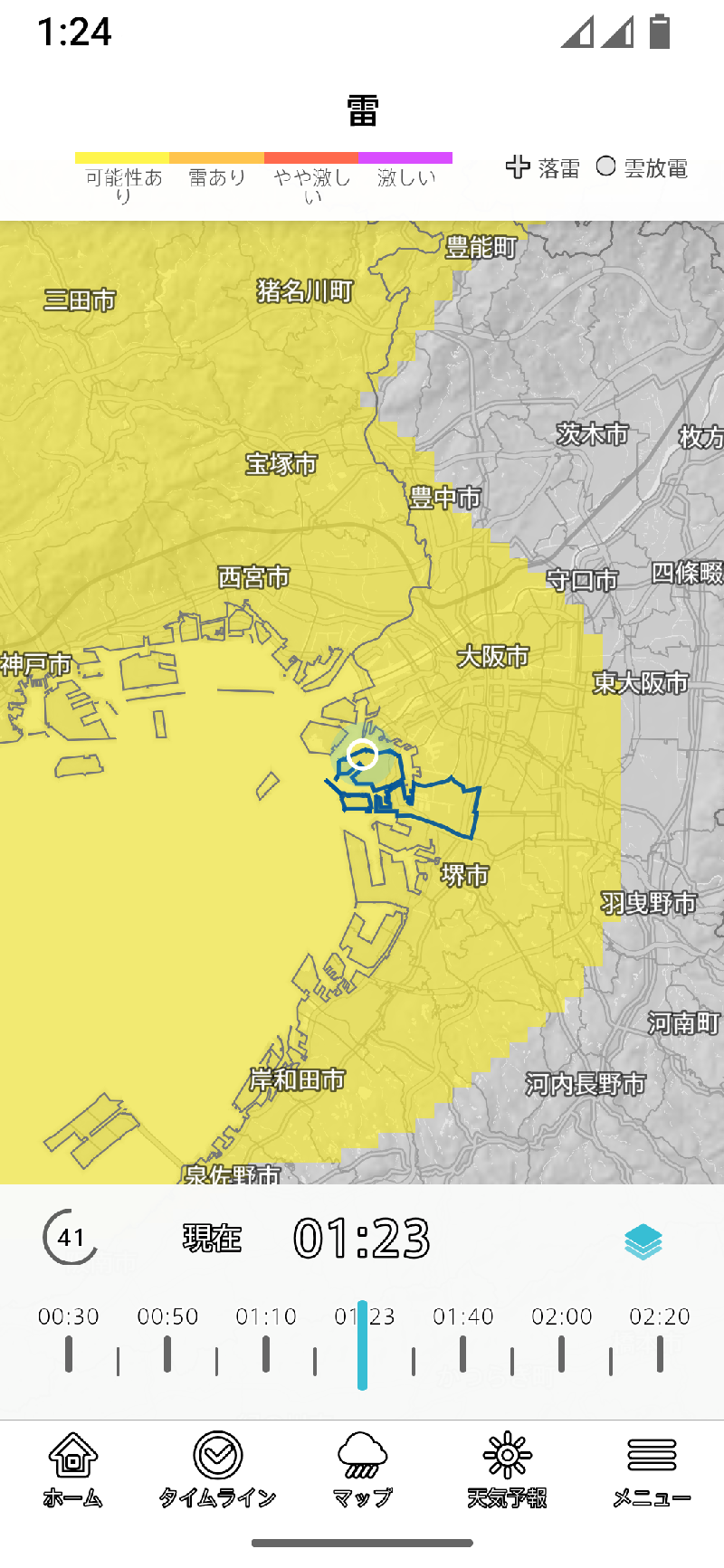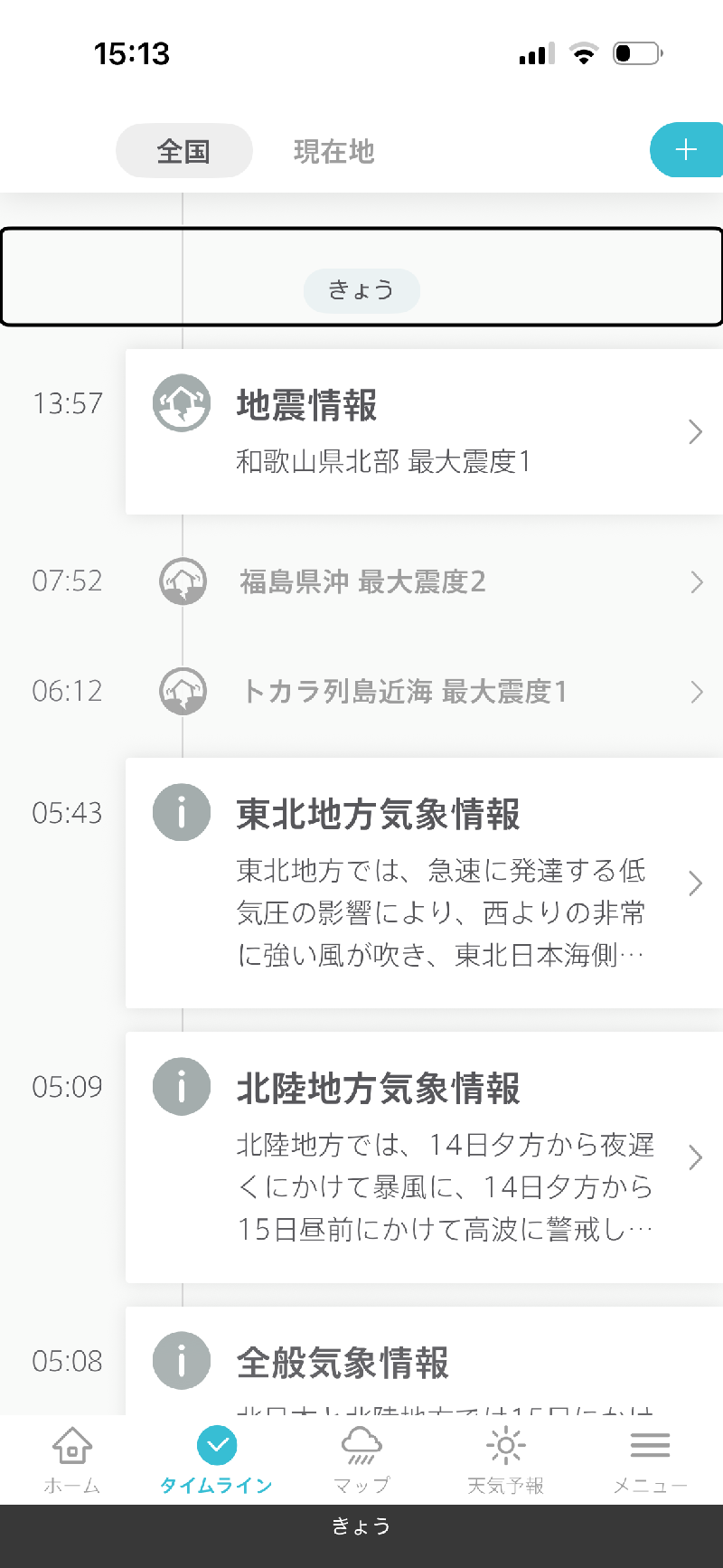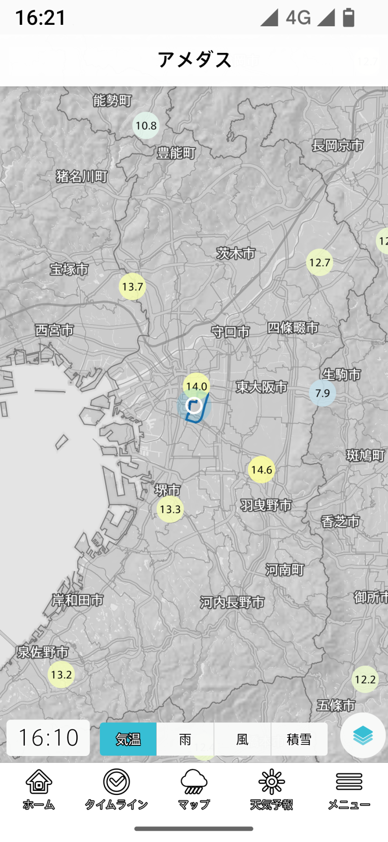 台風を選択すると、無条件に全国地図を選択します。以後は全国に切り替わってしまうので、登録地域や現在地のほかのレイヤーを表示しようとする場合には、一旦メニューラインでホームやタイムラインを選び、そこで登録地域や現在地を切り替える手間が生じます。