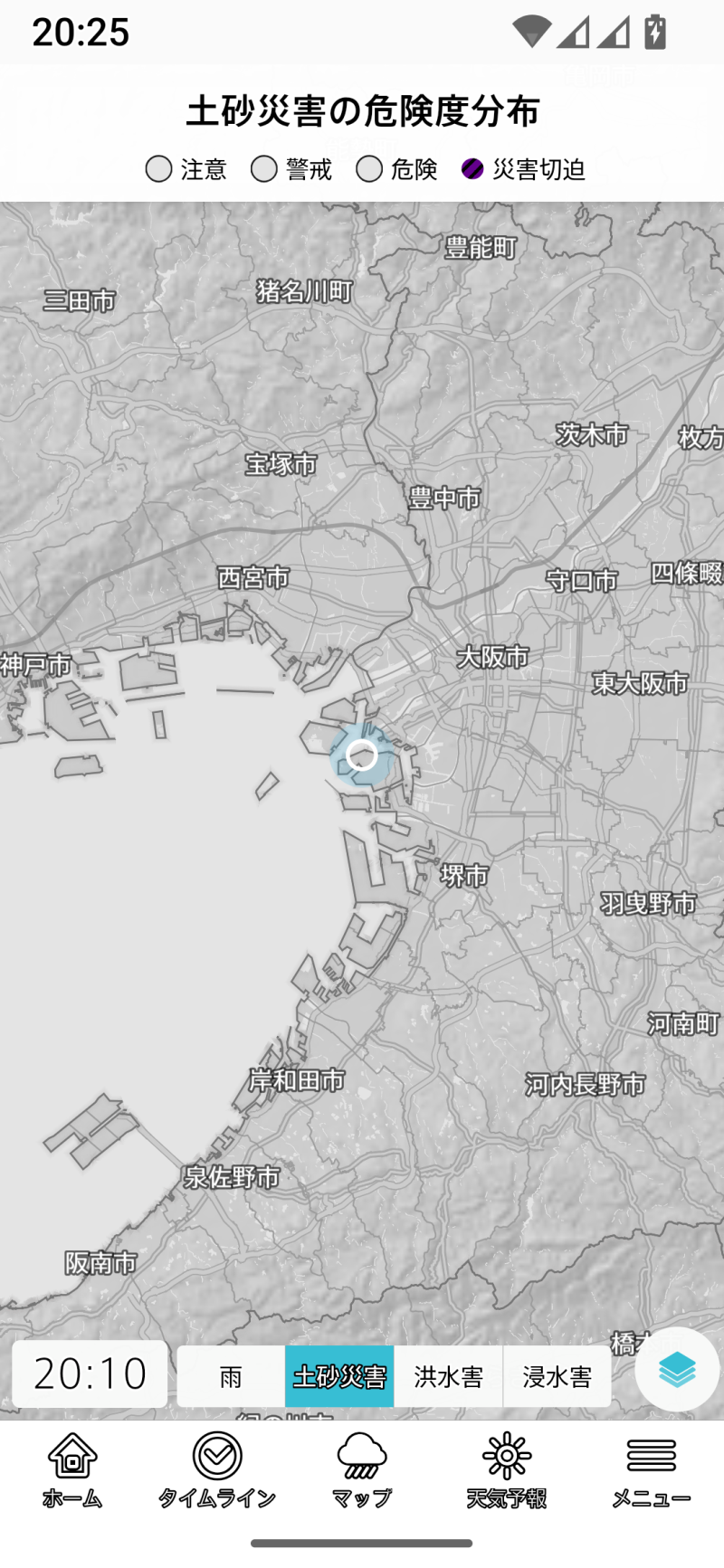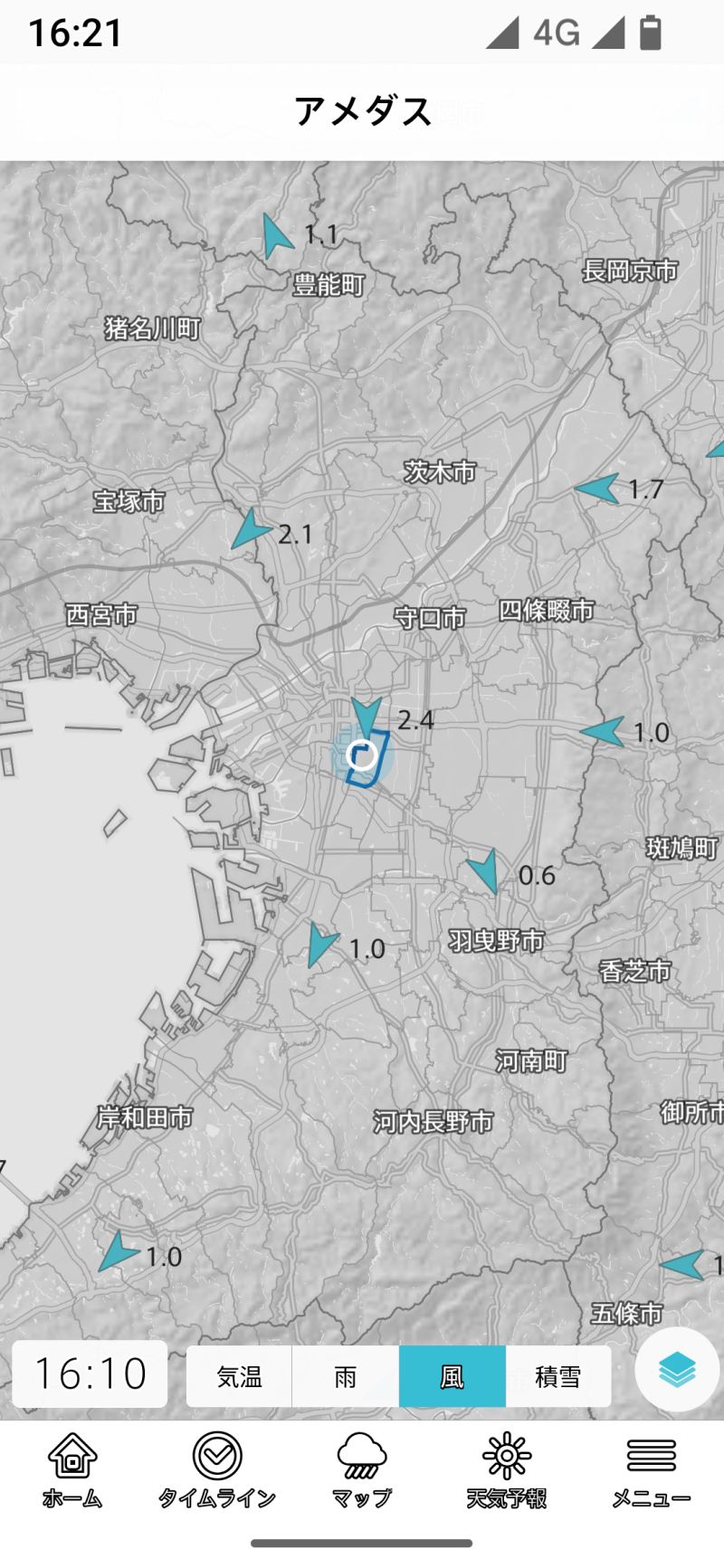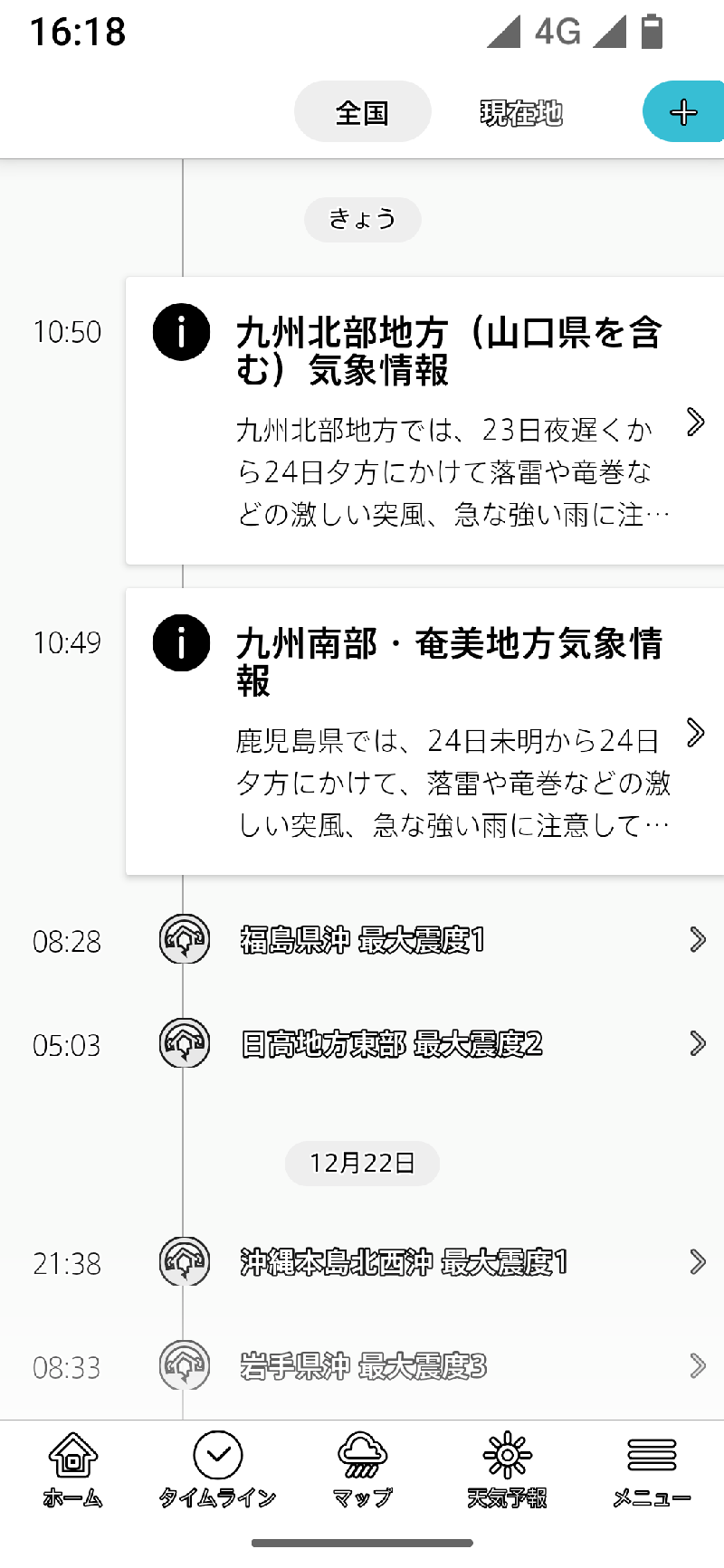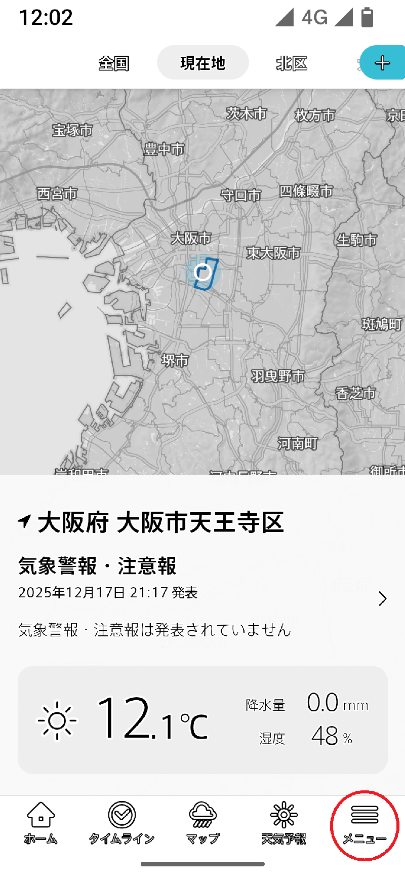 台風を選択すると、無条件に全国地図を選択します。以後は全国に切り替わってしまうので、登録地域や現在地のほかのレイヤーを表示しようとする場合には、一旦メニューラインでホームやタイムラインを選び、そこで登録地域や現在地を切り替える手間が生じます。
