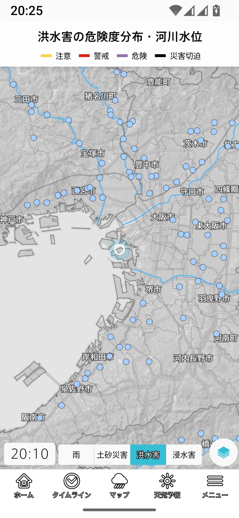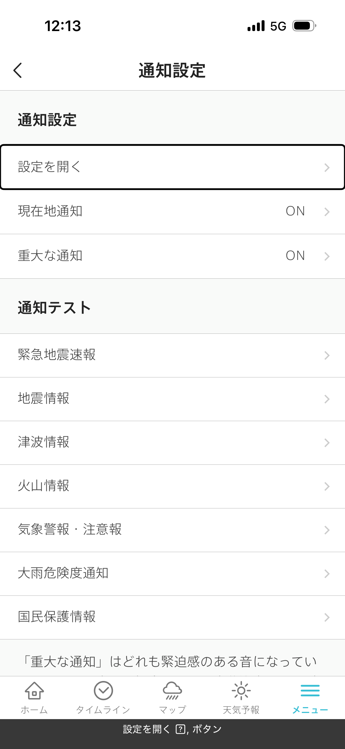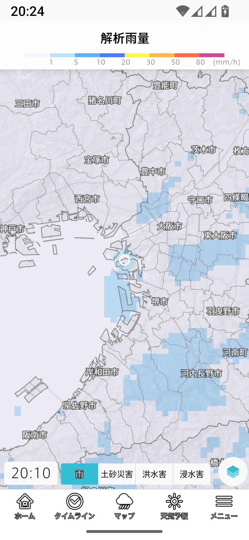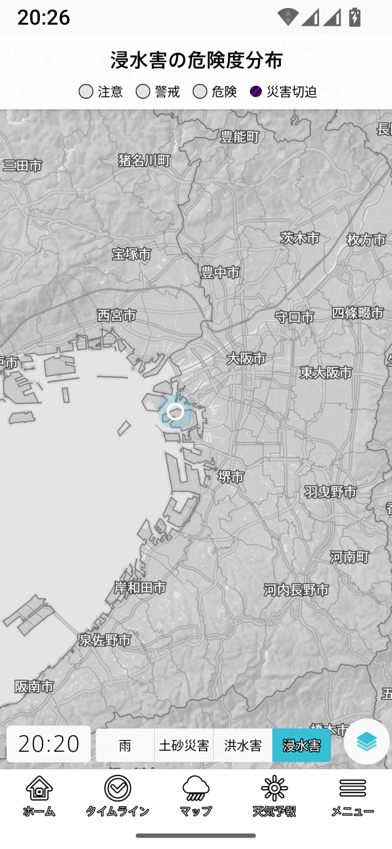 台風を選択すると、無条件に全国地図を選択します。以後は全国に切り替わってしまうので、登録地域や現在地のほかのレイヤーを表示しようとする場合には、一旦メニューラインでホームやタイムラインを選び、そこで登録地域や現在地を切り替える手間が生じます。