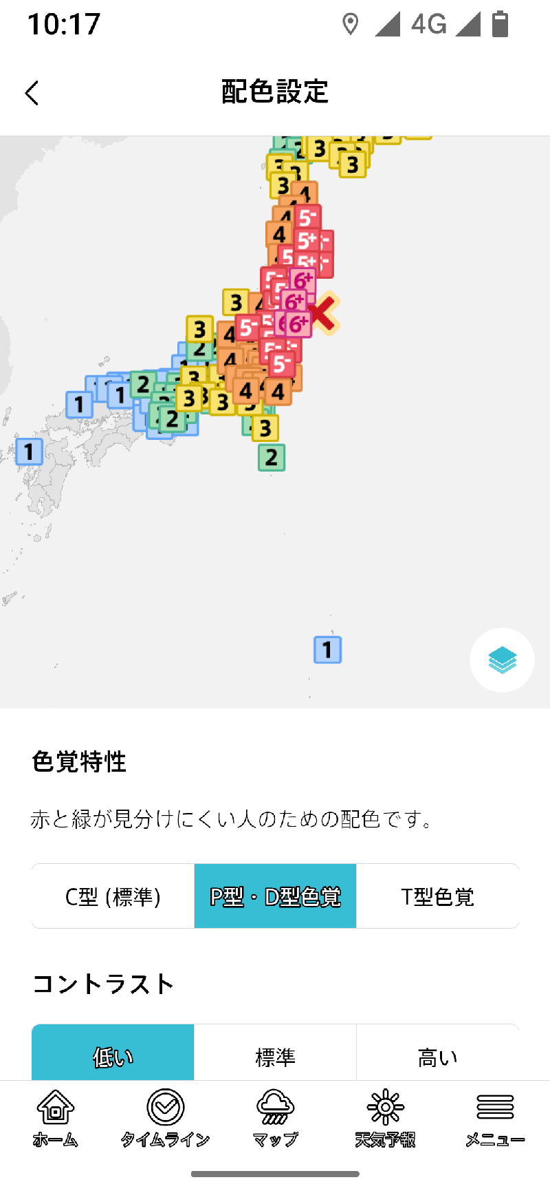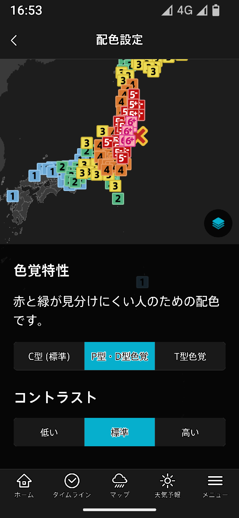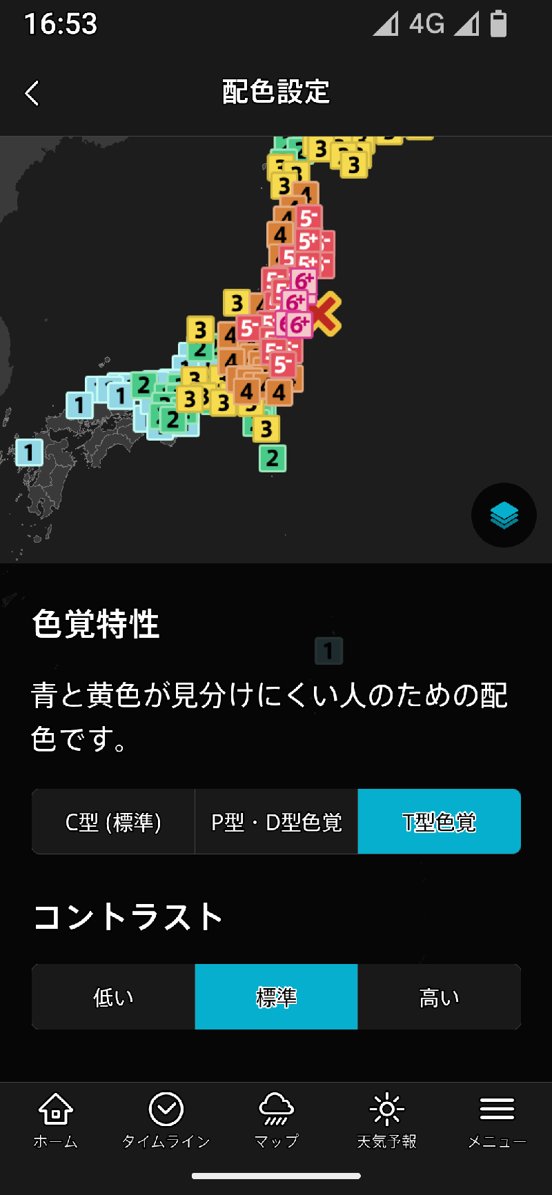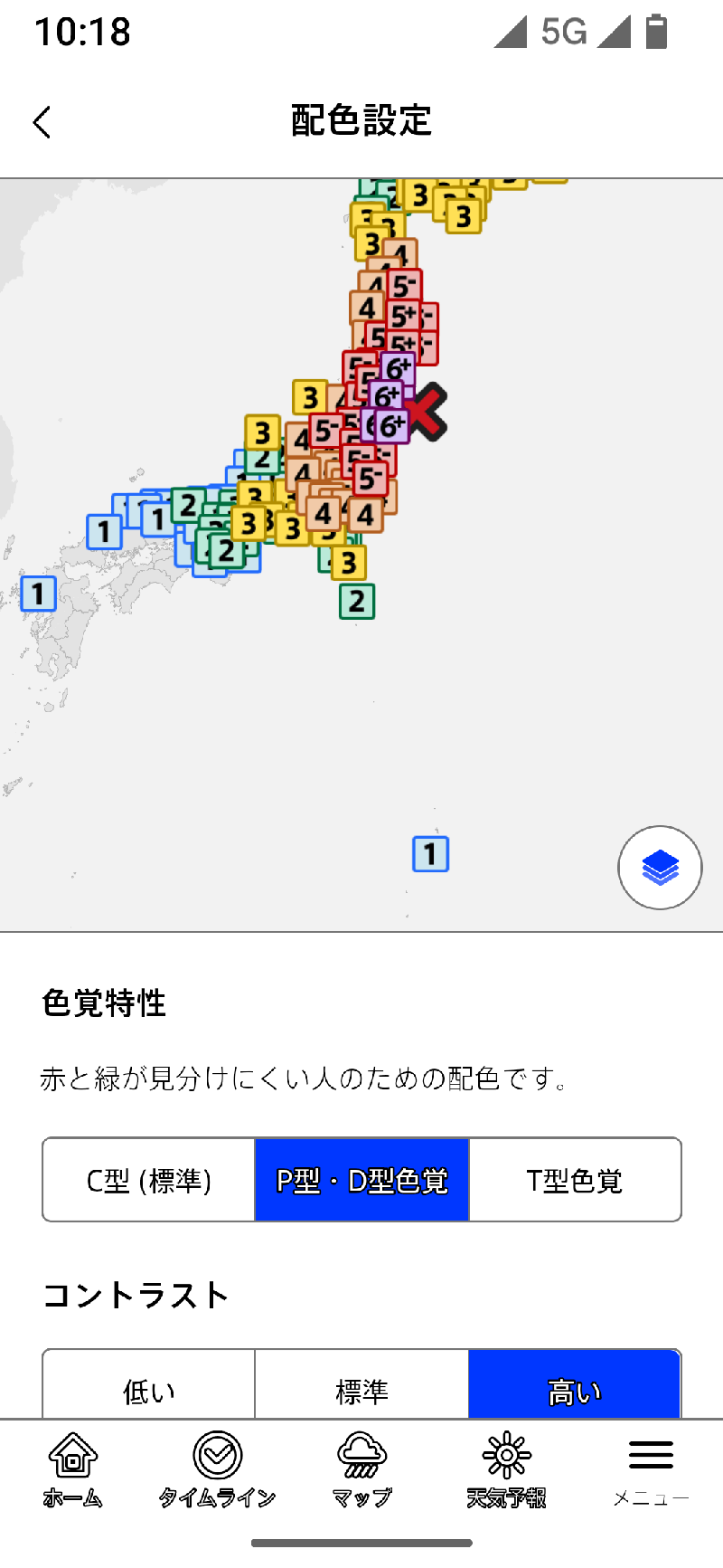 色覚特性では、主に地図上の表示される震度や雨雲の強さなどの区分を見やすくする設定です。
