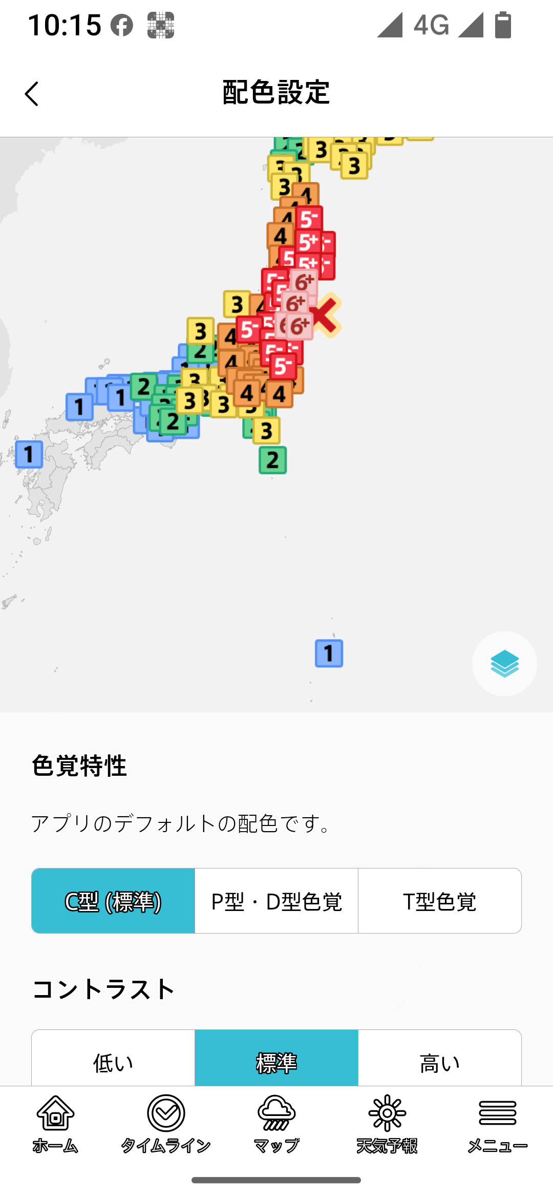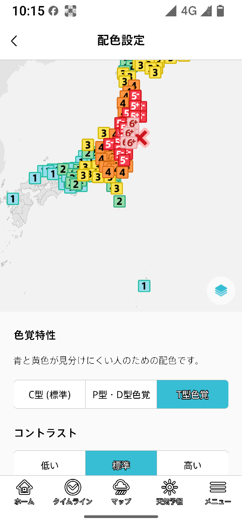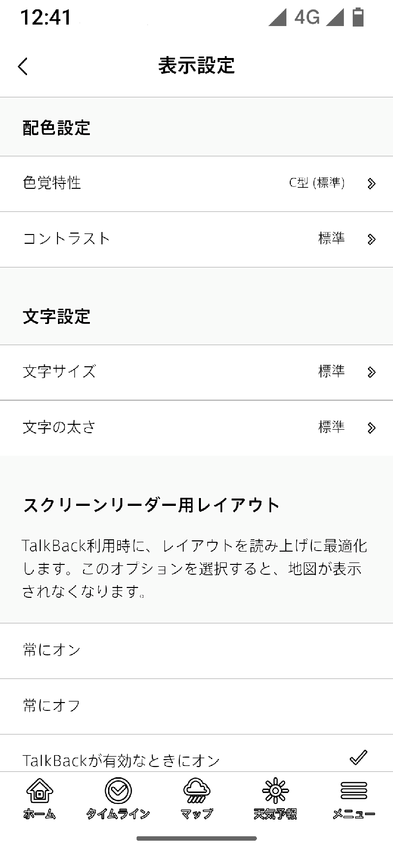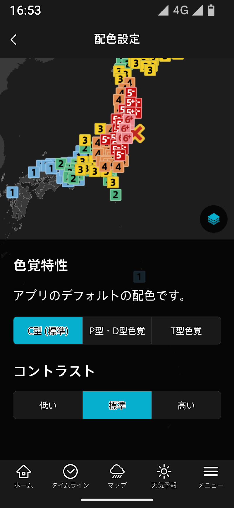 色覚特性では、主に地図上の表示される震度や雨雲の強さなどの区分を見やすくする設定です。