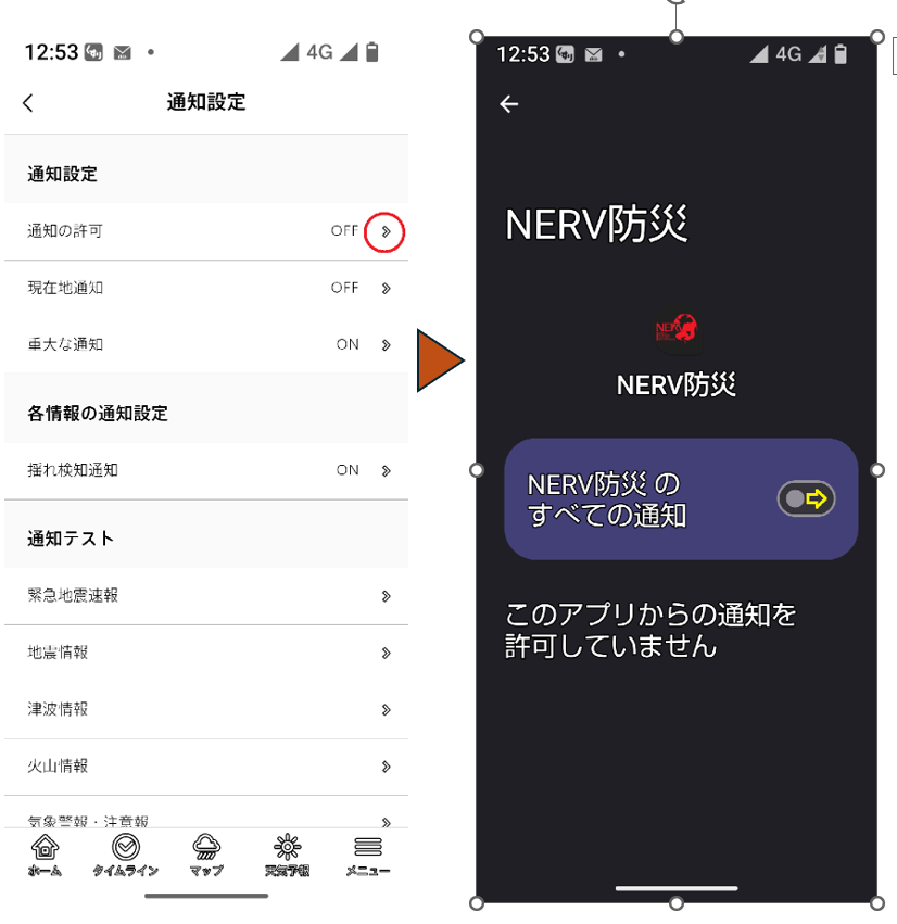 「設定を開く」の項目をタップすると、「NERV防災アプリにアクセスを許可」する画面になります(左図右)。