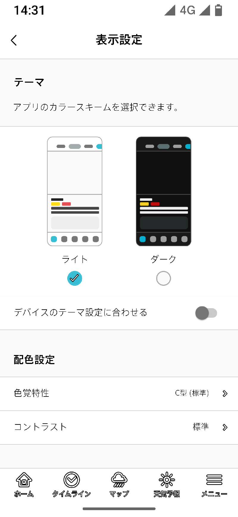 「デバイスのテーマ設定に合わせる」は、そのデバイス全体のテーマにあわせて、ライト又はダークのいずれかを自動設定します。