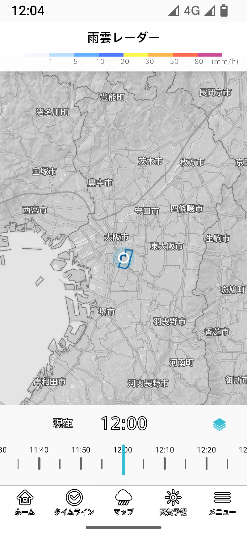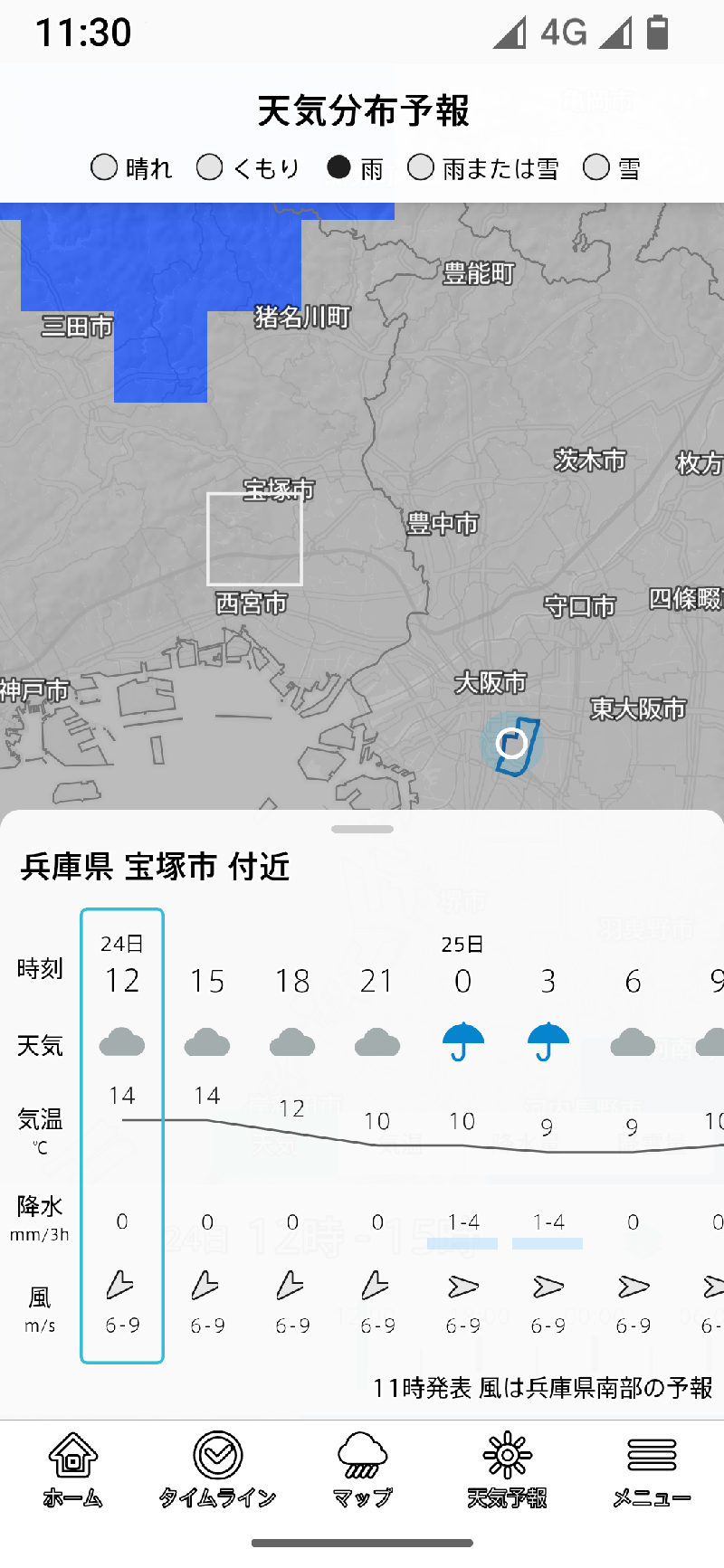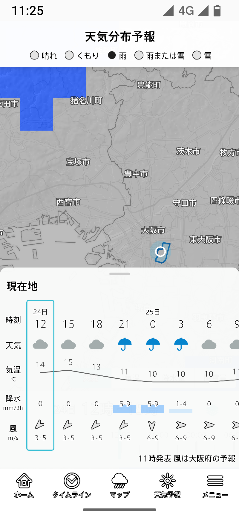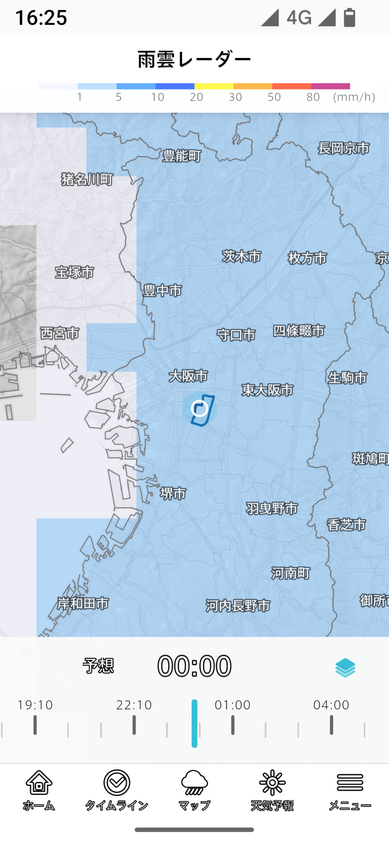 雨雲レーダーは地図の下にはタイムラインスライダーがあり、過去1時間、今後14時間の間を移動できます。