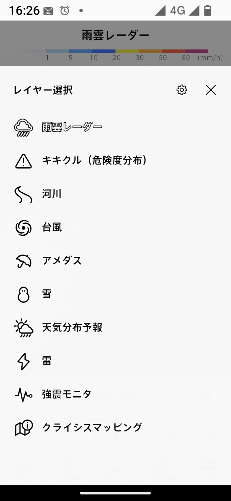 なお、レイヤー選択画面からは雨データ画面が表示されます。