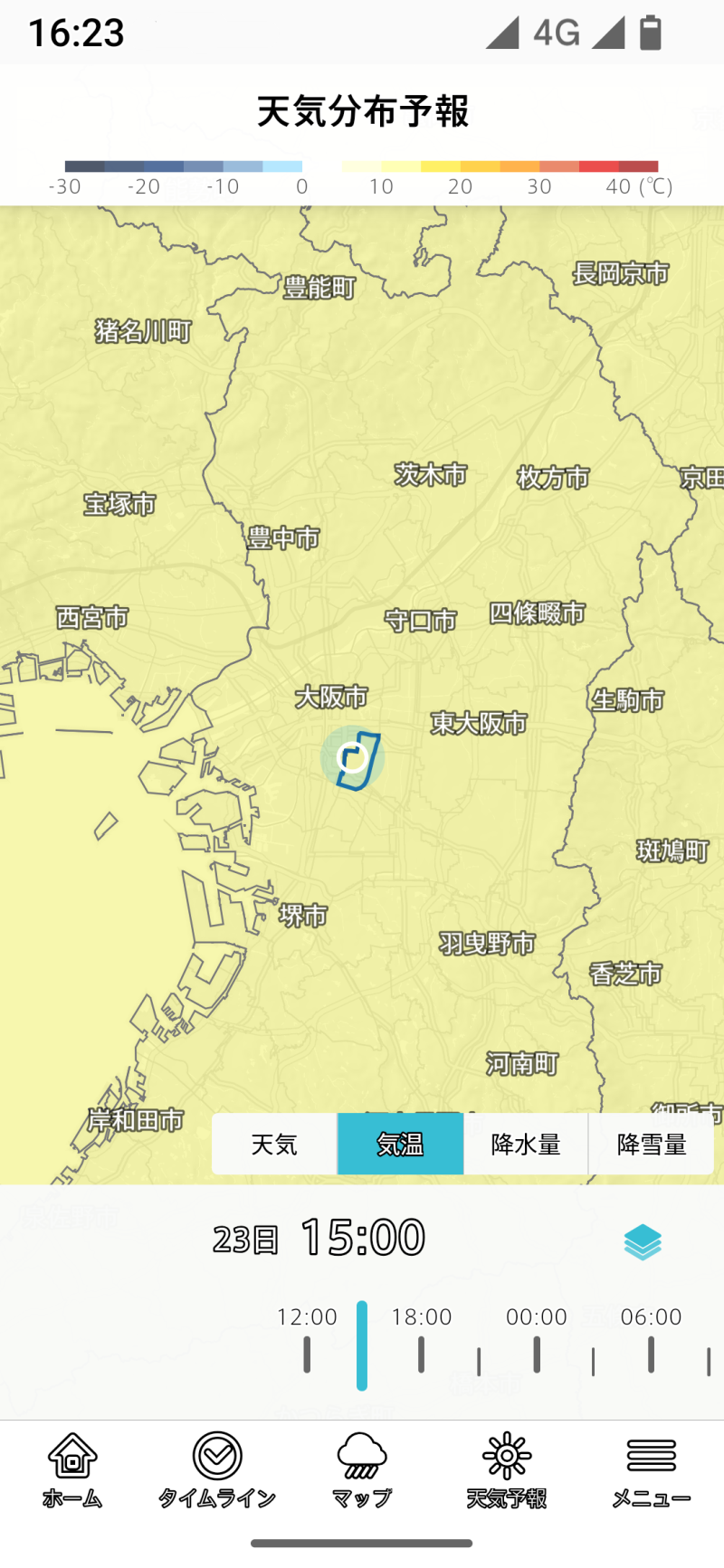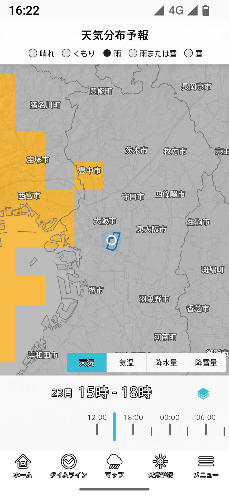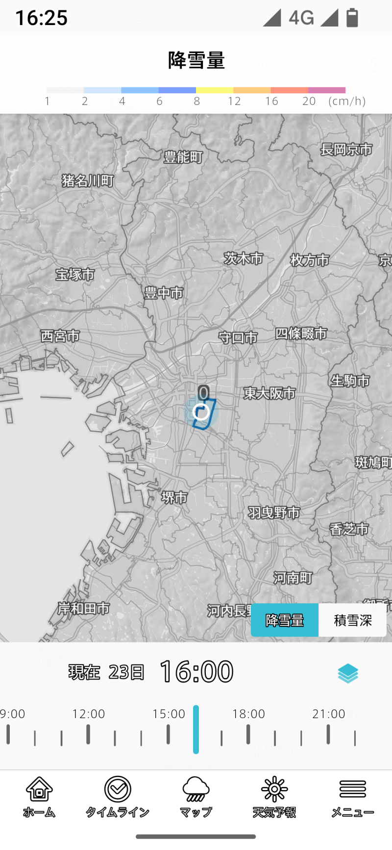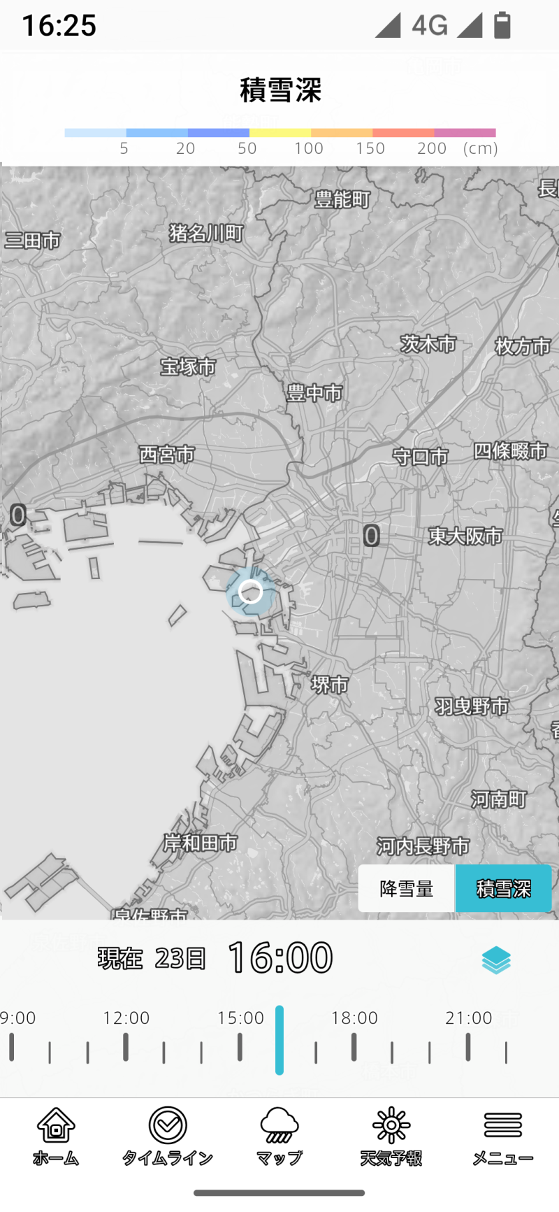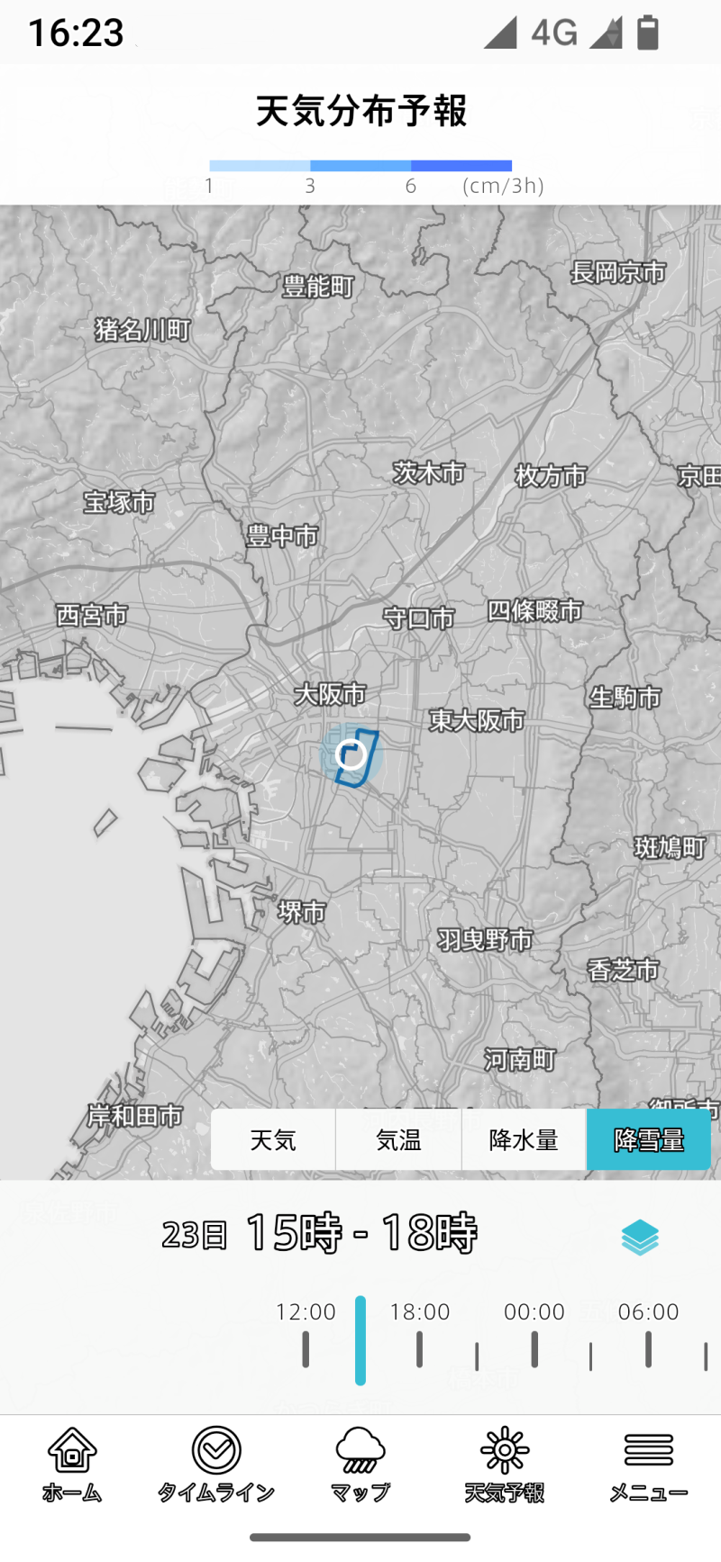 地図の下にはタイムラインスライダーがあり、過去24時間、今後6時間後まで移動できます。冬季には便利な機能です。