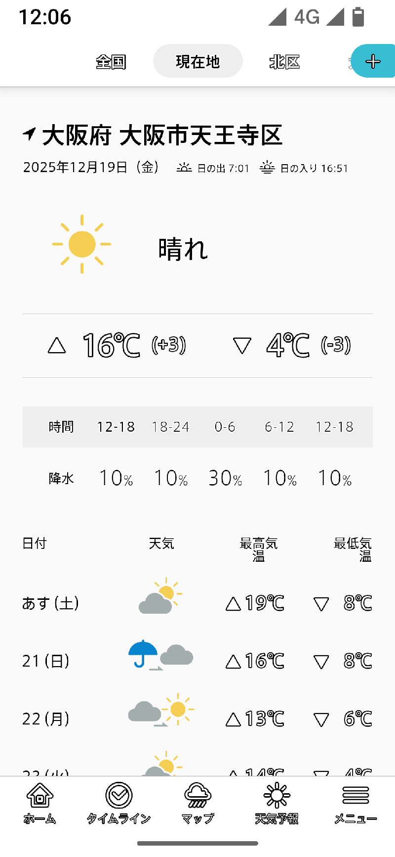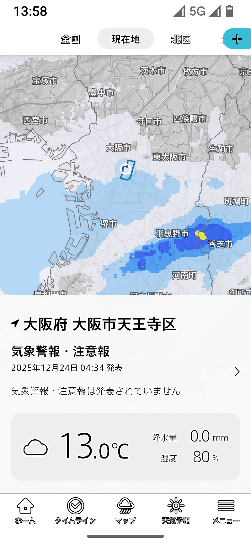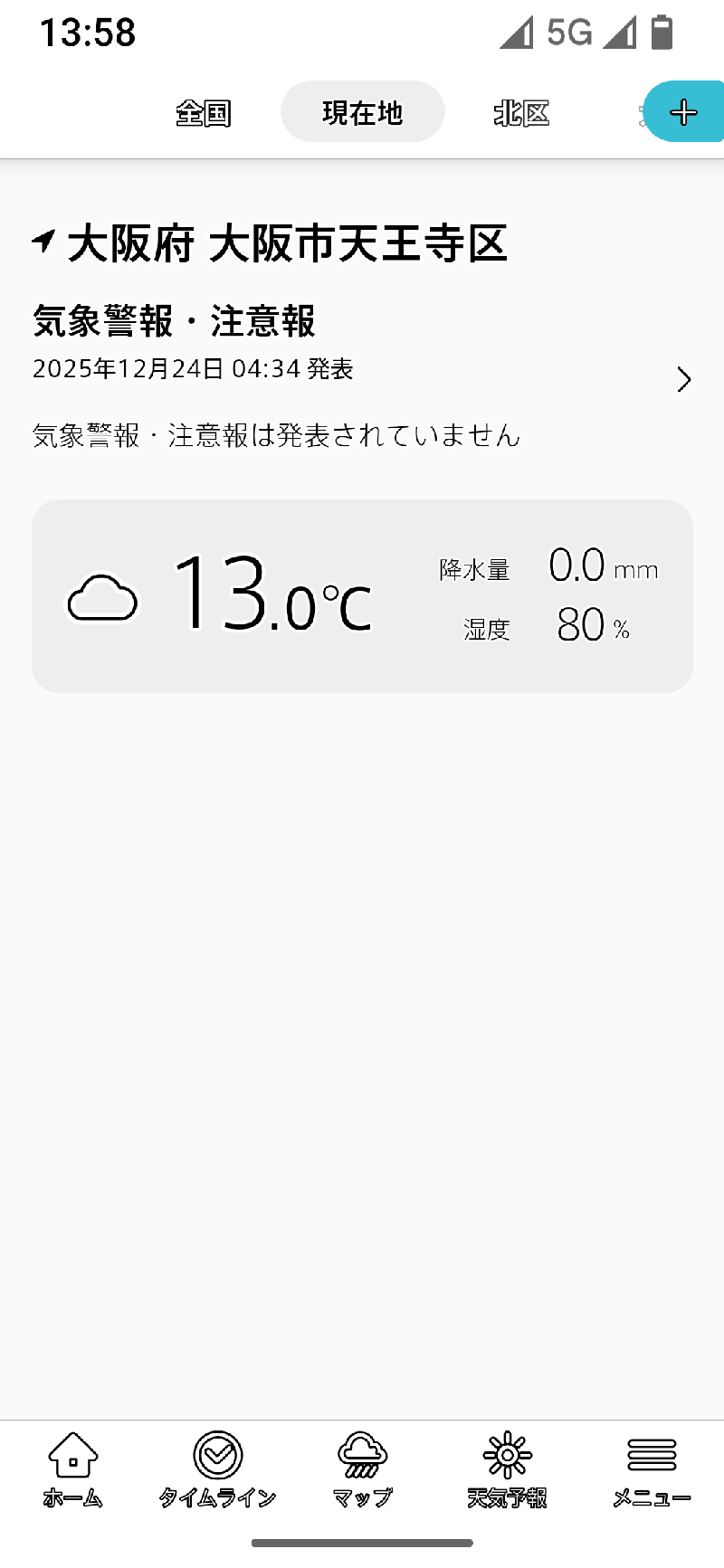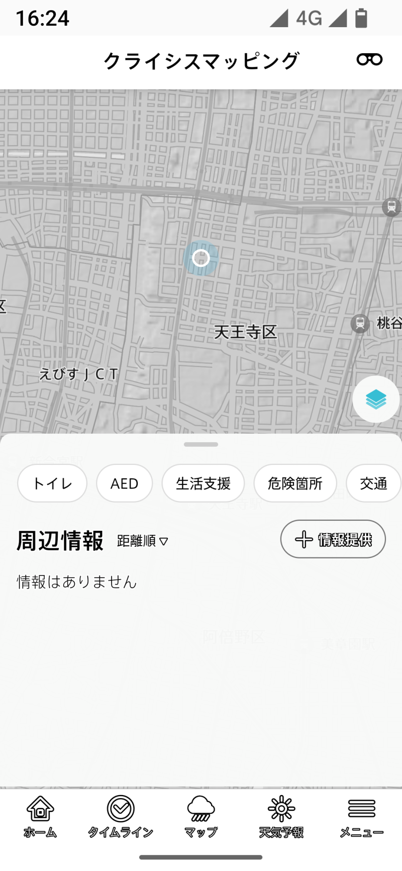 タイムラインをタップすると直前に開いていた登録地域のタイムラインが現れますが、起動時には登録地域が現在地にリセットされるので、現在地のタイムラインが表示されます。