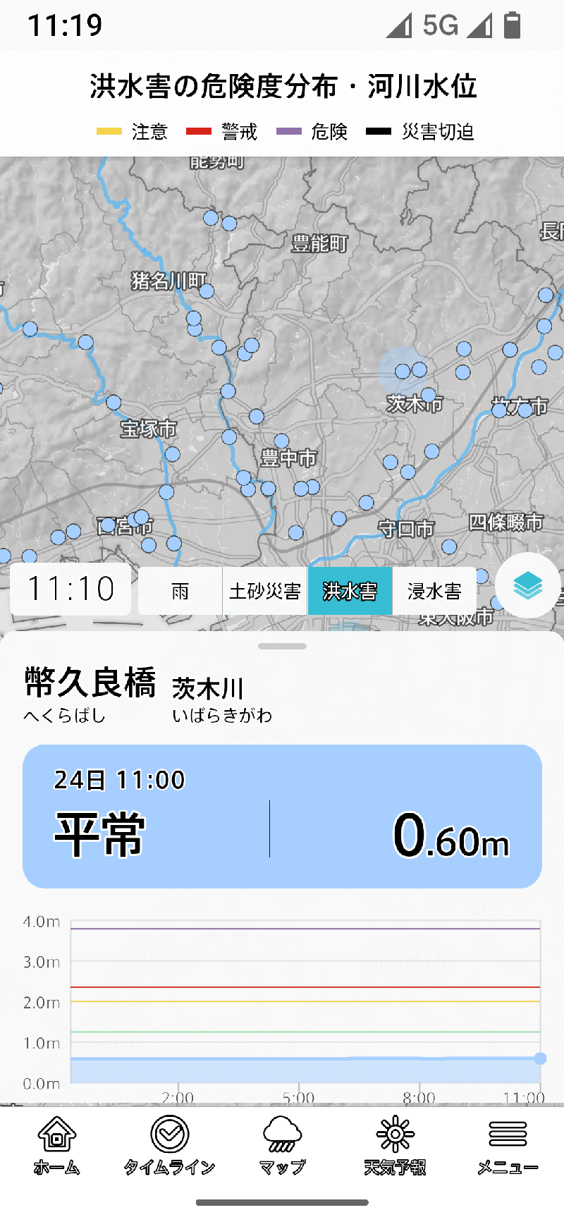 また、洪水害は観測地点の過去12時間の水位変化を見ることができます。