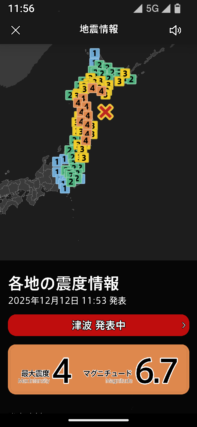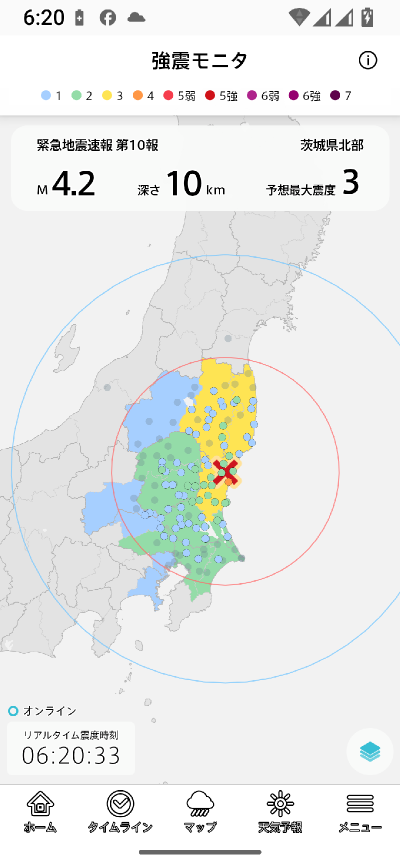 強震モニタはほぼリアルタイムの地震モニターです。自動で全国地図になりますが、この設定はほかの地図に影響しません。