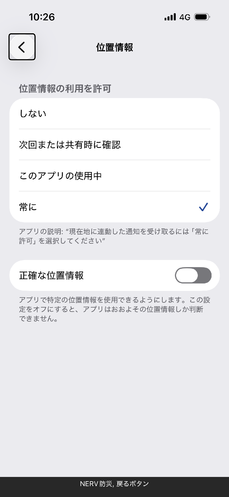 まず、「NERV防災アプリにアクセスを許可」する画面のうち、一番上の「位置情報」をタップします。