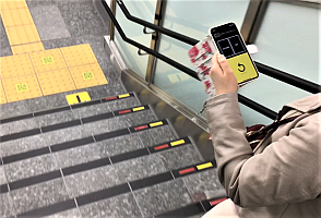 階段も最上段と最下段前の警告ブロックにQRコードがあり、階段のはじまりであること、階段が上りか下りか、段数や踊り場の数等を知らせてくれます。また、階段を上り(又は下り)切った先では、今いる階数と進行方向が案内されます。